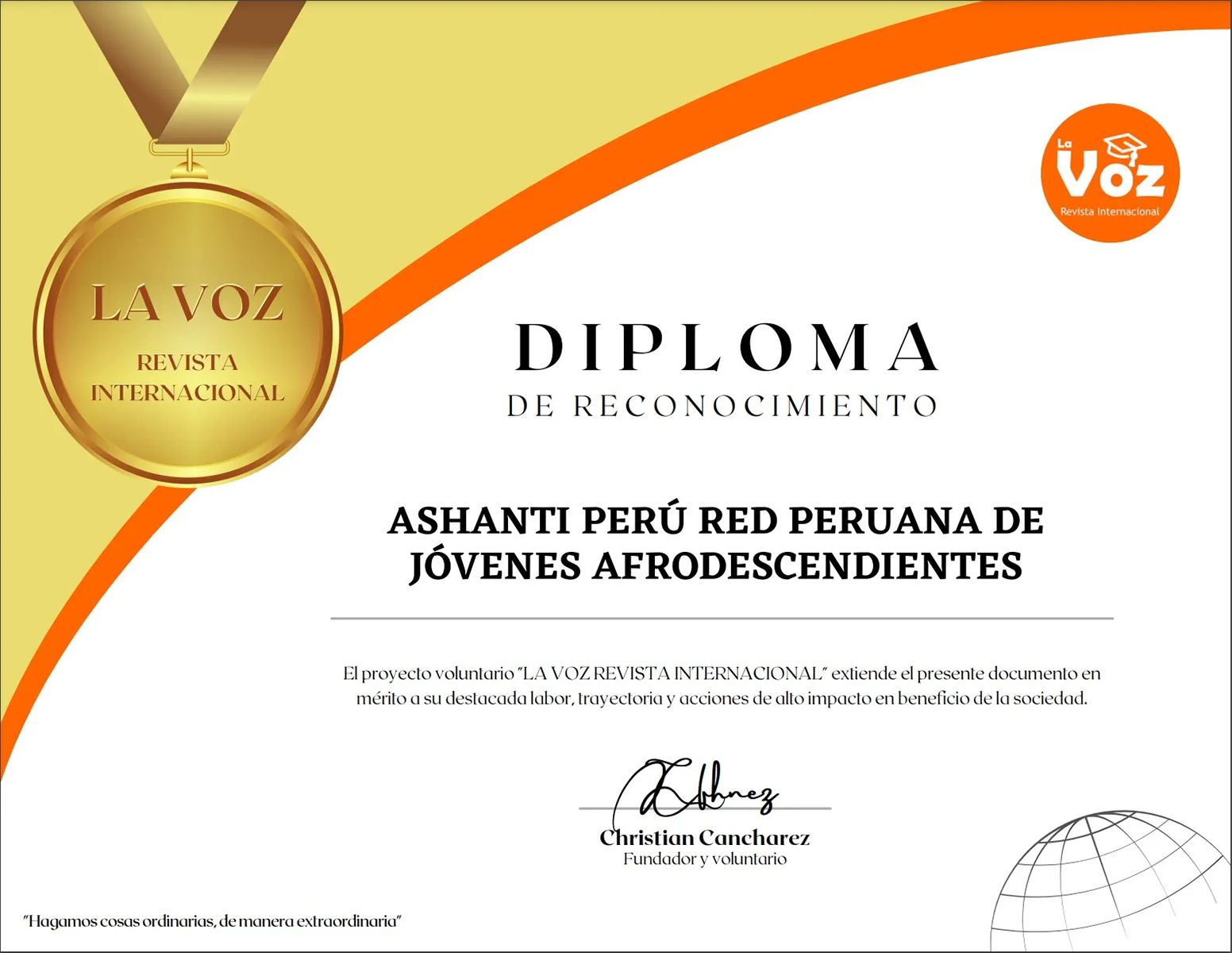 En el 2012, el JNE le otorgó el reconocimiento nacional “Mejores prácticas ciudadanas de jóvenes” a Ashanti por su trabajo constante en la promoción de la agenda joven afrodescendiente en el país. Este trabajo se concretizó con la inclusión.